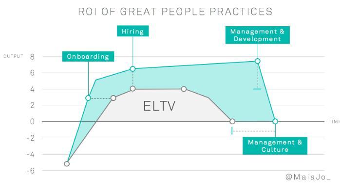 To gain support and investment for people initiatives, recruiting and talent teams should instead focus on articulating a story around the expected return in terms of Employee Lifetime Value (ELTV). But rather than try to calculate ELTV for every employee, which is nearly impossible, they should compare the relative difference in ELTV between two subsets of the employee base (those who took part in a particular initiative vs. those who didn’t). This approach keeps things simple, while also providing a meaningful way to assess ROI.