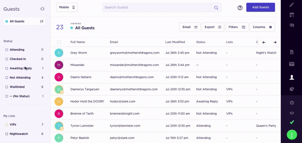 You can now quickly filter your guests based on list and/or status. And, it gets better. You can also completely customize your filters. Anyone looking to target groups based on personal info, responses to custom questions, or interactions with emails… this is your time to shine.
