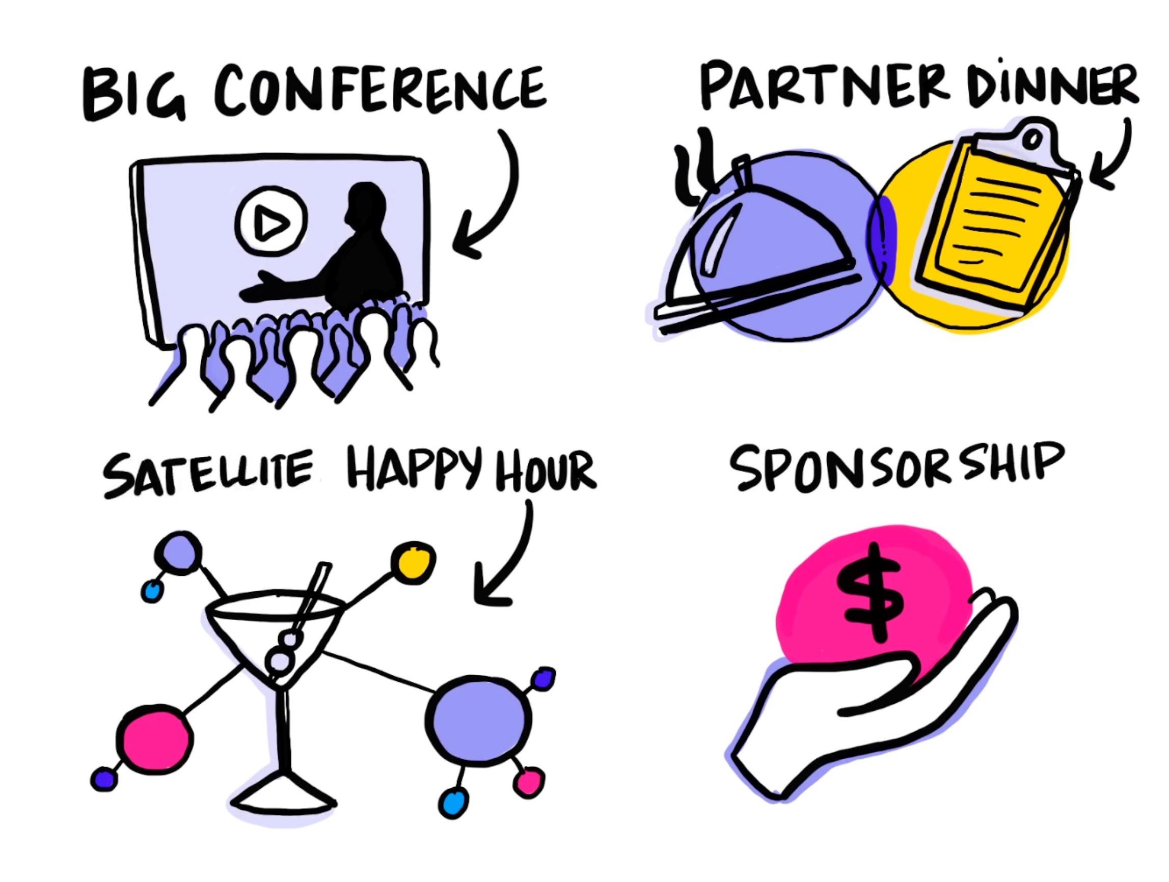 This is building off of other big events. If you're able to find a trade show or a large conference like Dreamforce and have a satellite happy hour or dinner around that event, that's another way to actually drive net new leads. There are also people who are just at that trade show and show up to your happy hour.