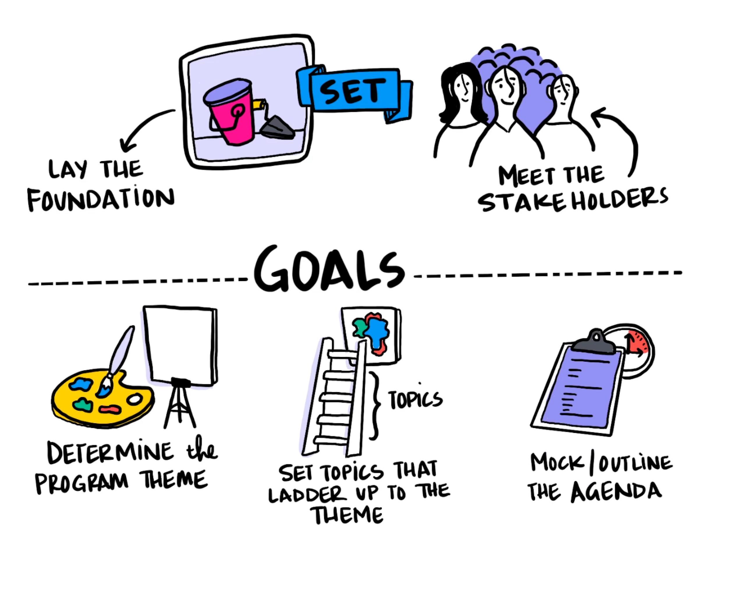 The first step is to set a theme. And what that means is, you need to lay the foundation for the event's content. The best way to do that is to host a meeting with all the stakeholders. That means get your head of marketing, comms, all of the most important executives in the room, get your event team in the room, and try to leave that meeting by accomplishing three goals.