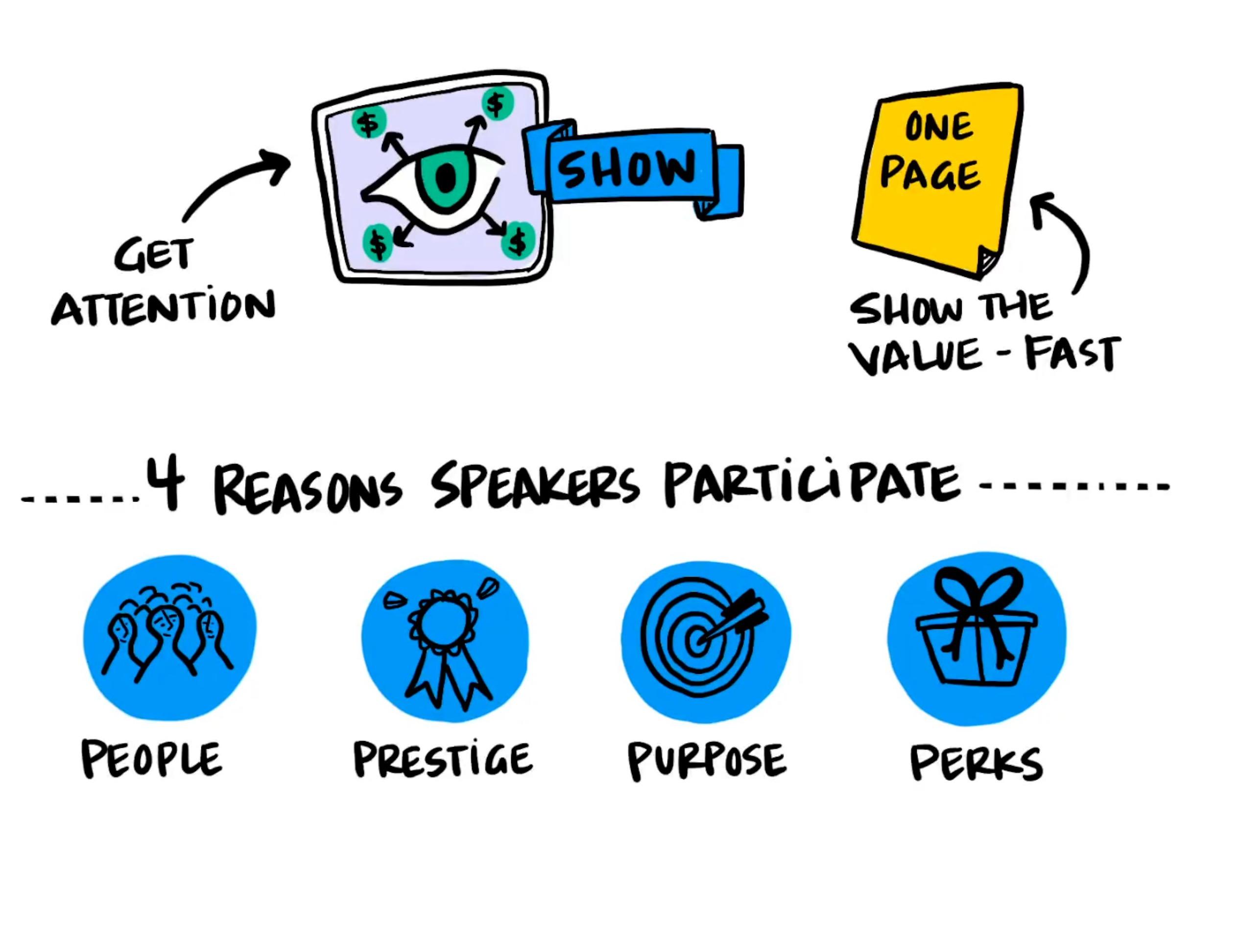 One of the best ways to show value is to put it into a brief or into a one-pager that you can quickly email to a speaker. The faster that you can show them the value to them, the faster you're gonna get their attention and potentially lock them in as a speaker. As we started doing this we realized that there were really four reasons that people would actually want to participate in our event -- that speakers would actually want to get on stage.