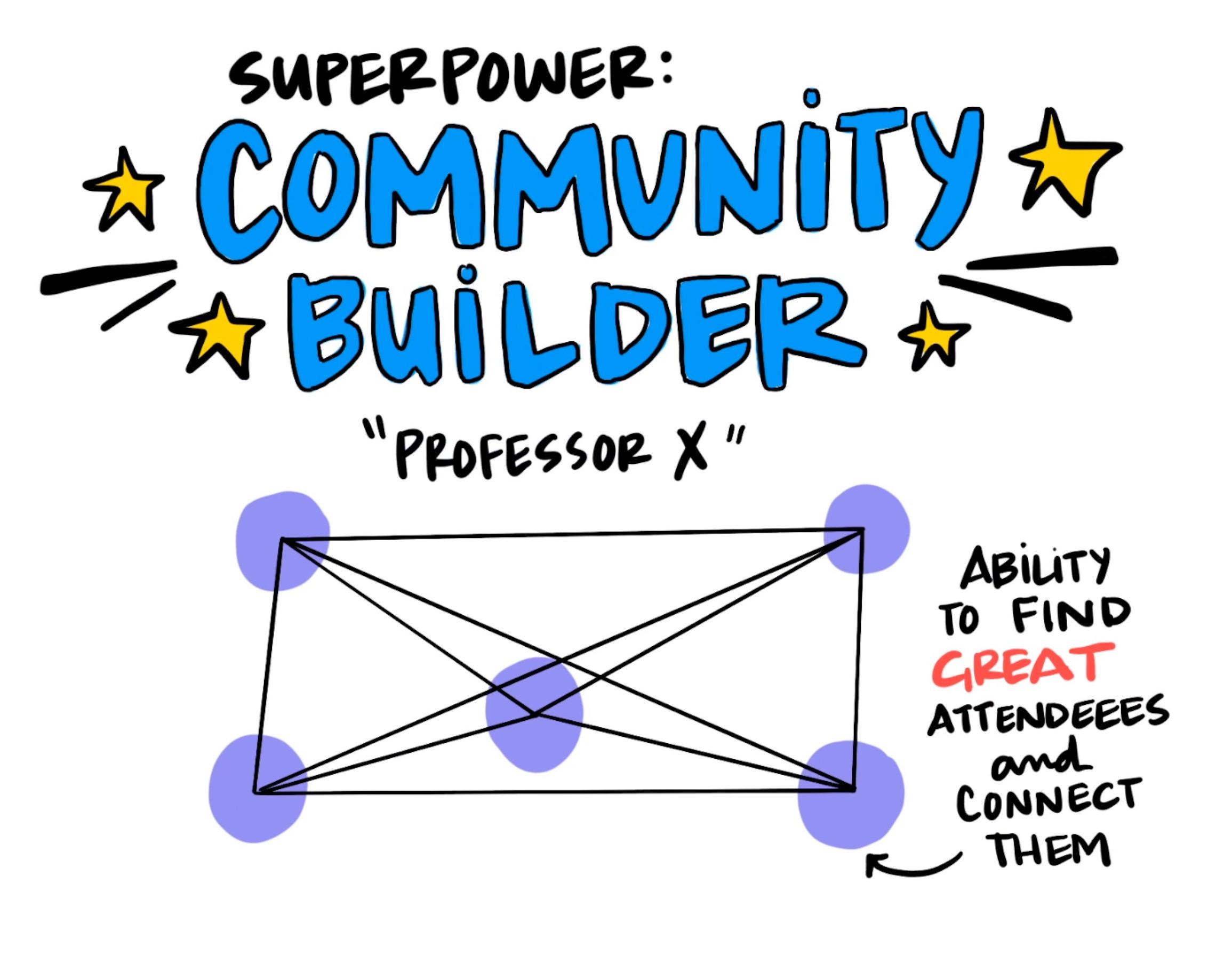 Now, this next one would be my choice for most powerful superpower. And unfortunately, I don't have a great metric for how to measure this. But like Professor X, if your event is able to find great attendees and connect them, and build a community, your event's superpower might be community-building.