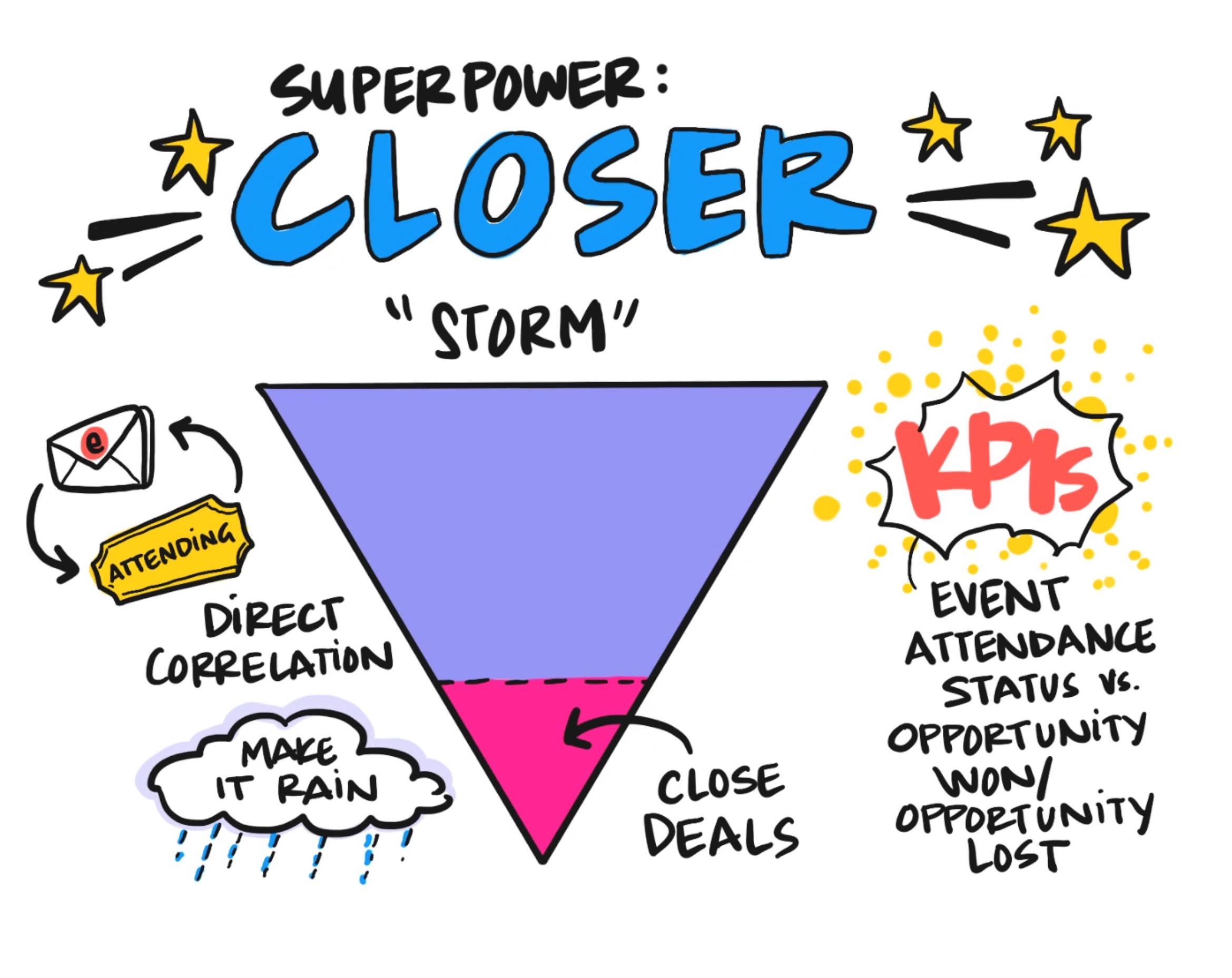 So if you find that when somebody attends one of your events, they are highly correlated to actually buying, more correlated to buying than somebody who doesn't attend your event, then your event might be like Storm. Right? You can make it rain. I love that one. This is the bottom of the funnel and that would be your event's super power.