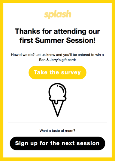 The thank you email included a link to a survey asking guests for their input on how we did. As a bonus we added a gift card incentive to encourage participants to take the survey. There also wasn't a need to create separate surveys for each session. All we did was include a question asking the guest to indicate which session they were giving feedback on.
