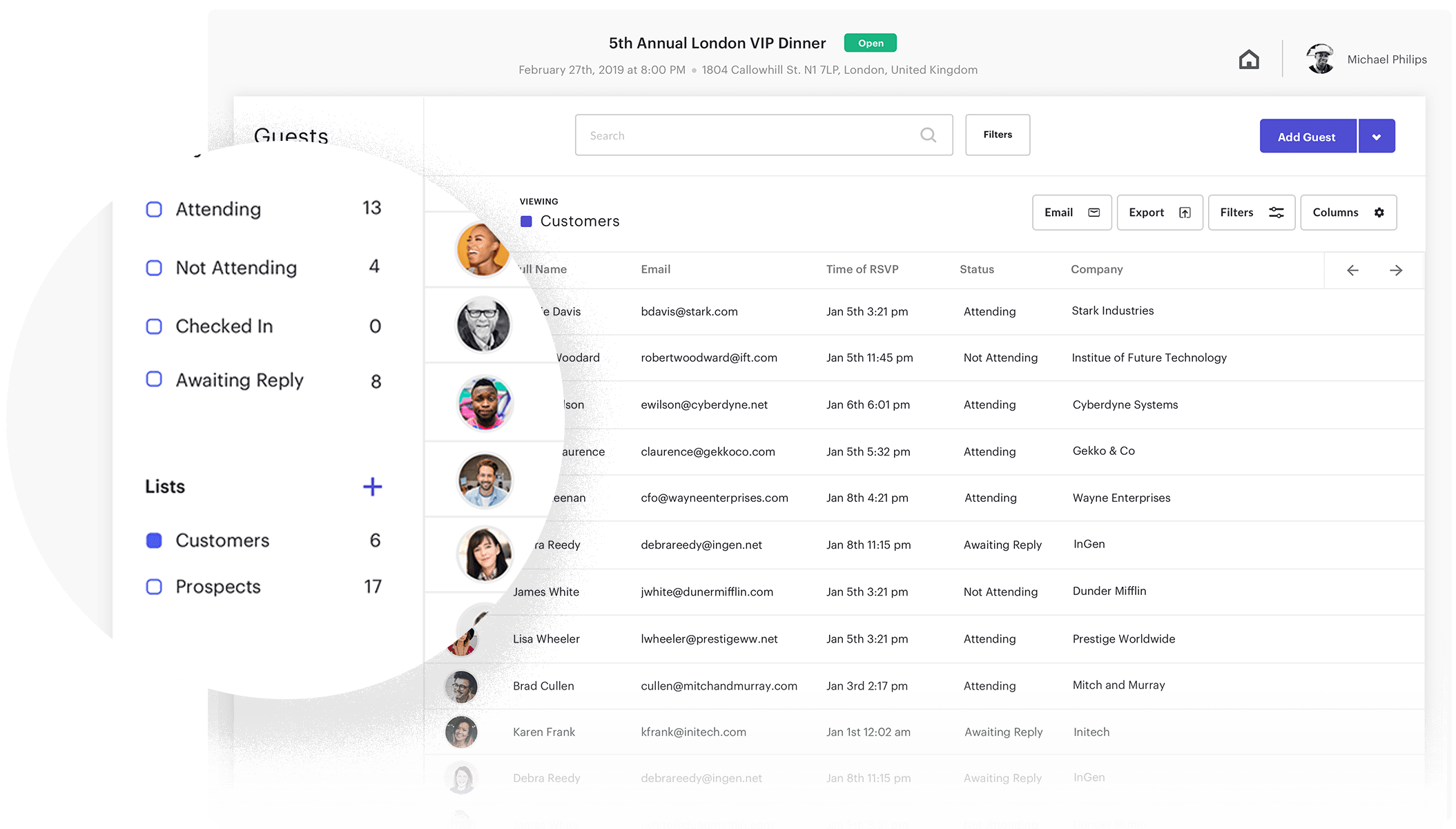 Quickly identify and segment target audiences with intuitive filters and sorting to understand who’s invited, who’s coming and who your best prospects are. Save and apply audience segments in one place or across multiple events.