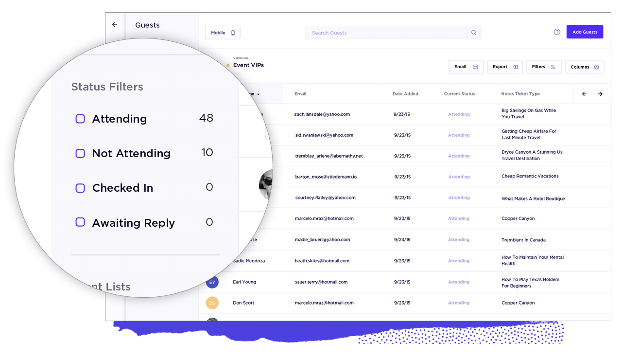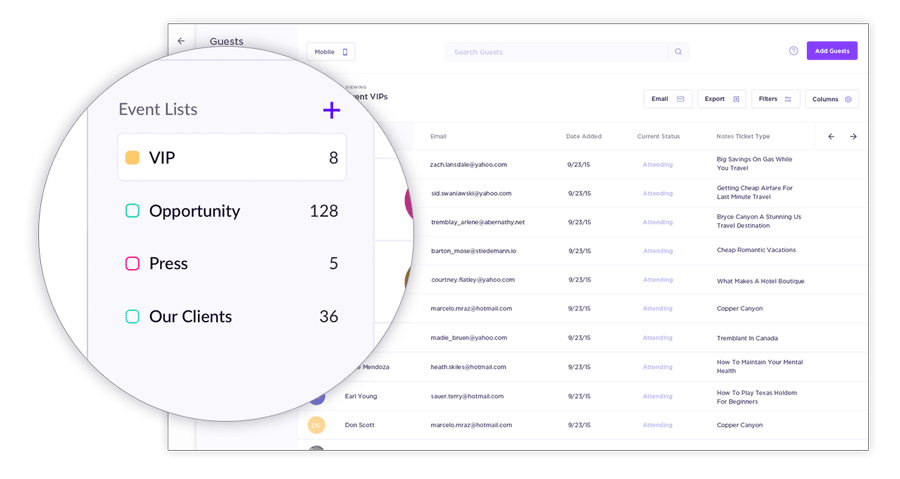 Capture audience data through RSVPs and check-ins to build robust profiles of your attendees and their guests. With smart guest lists, targeting, email communications and registration forms under one roof, you can optimize every touch point.