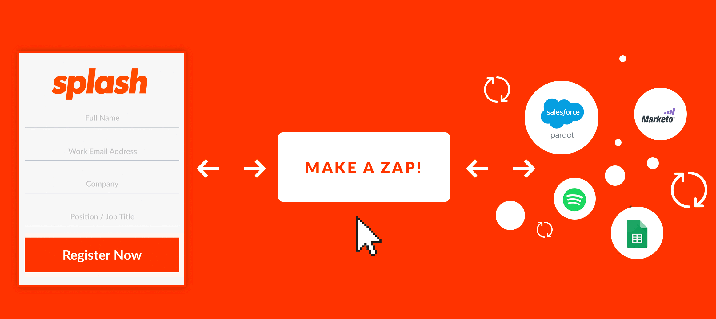 The Splash and Zapier Integration enables you and your team to automate everything from the smallest of tasks to the most complex of workflows. By seamlessly connecting Splash to your favorite platforms, you can improve your event performance and increase the efficiency of your events -- all with a simple drag-and-drop.